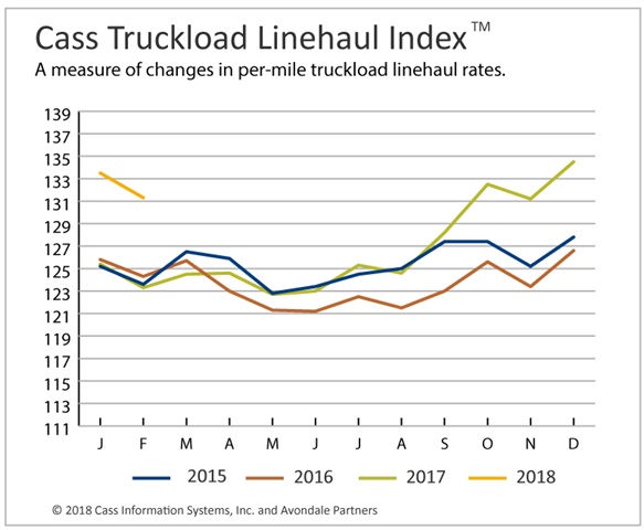 February's Cass Truckload Linehaul Index continued the year-over-year acceleration established in November, December, and January, up 6.3%, 6.2%, and 6.5%, respectively, by posting another 6.5% increase.