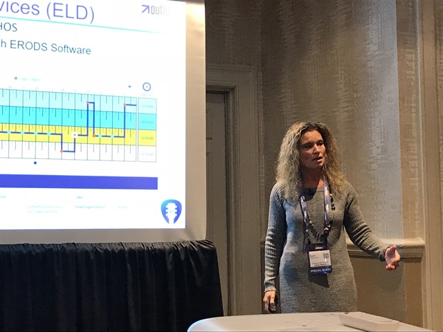 CVSA's Kerri Wirachowsky speaking during a panel on ELD enforcement at Omnitracs' Outlook 2018 user conference in Nashville. Photo: Jim Beach