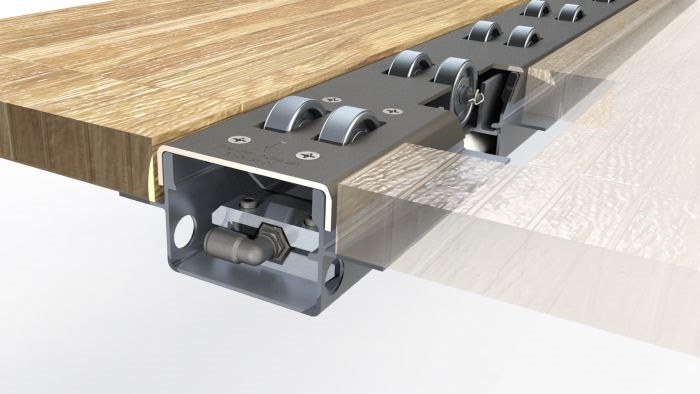 The pneumatic roller track system is powered by the pneumatics off of a truck's existing air supply. When powered on, the racks raise from the trailer floor and after use, the system allows a trailer to convert back to a flat floor for general freight. The track system uses a high-strength, 11-gauge stamped steel top plate has a galvanized finish to fight corrosion and improve durability and it is designed to withstand regular forklift usage.