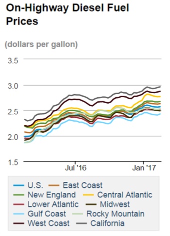 The average price of on-highway diesel fuel fell by 0.7 cents last week, settling at $2.565 per gallon at the pump. After peaking at nearly $2.59 per gallon in early January, the price has hovered around $2.56 per gallon for the past month. Compared to the same week in 2016, the price of diesel fuel is now 58.5 cents more expensive per gallon.