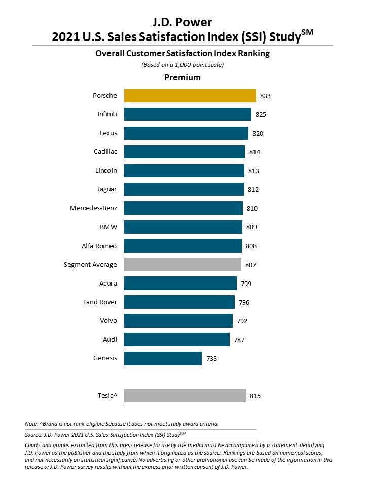 Porsche ranks highest in satisfaction with dealer service among premium brands with a score of 833. Infiniti (825) ranks second, followed by Lexus (820), Cadillac (814) and Lincoln (813).