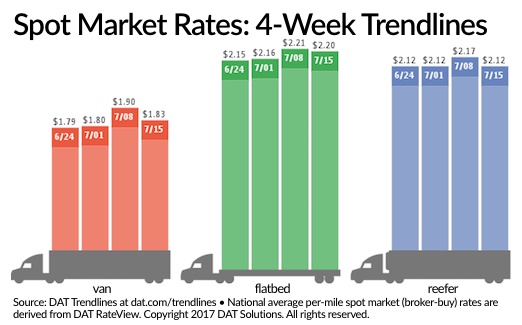 Higher demand did not lead to higher rates, however, as urgency subsided during the first full week after the Fourth of July holiday. National average spot van, refrigerated, and flatbed rates all settled down.